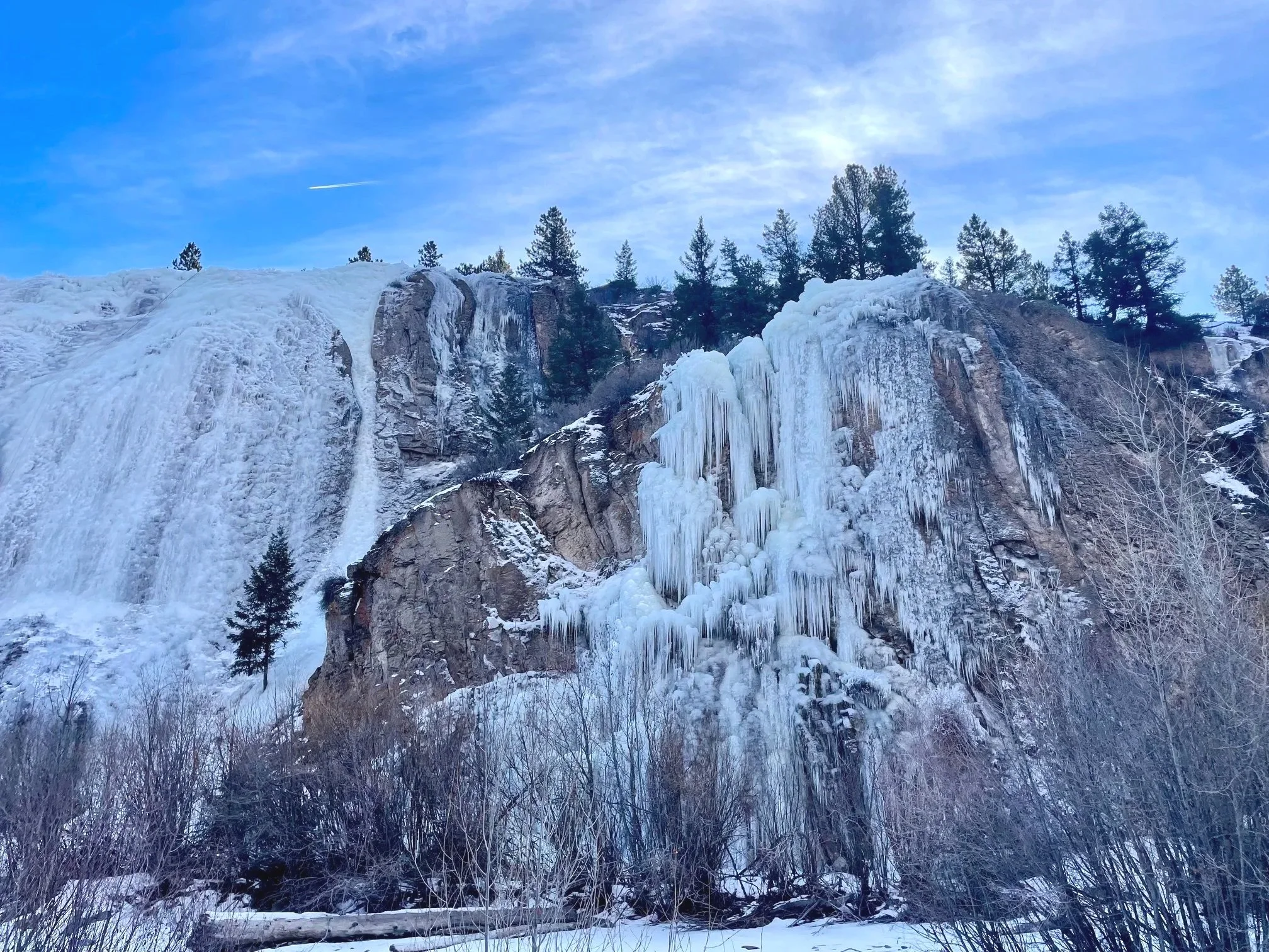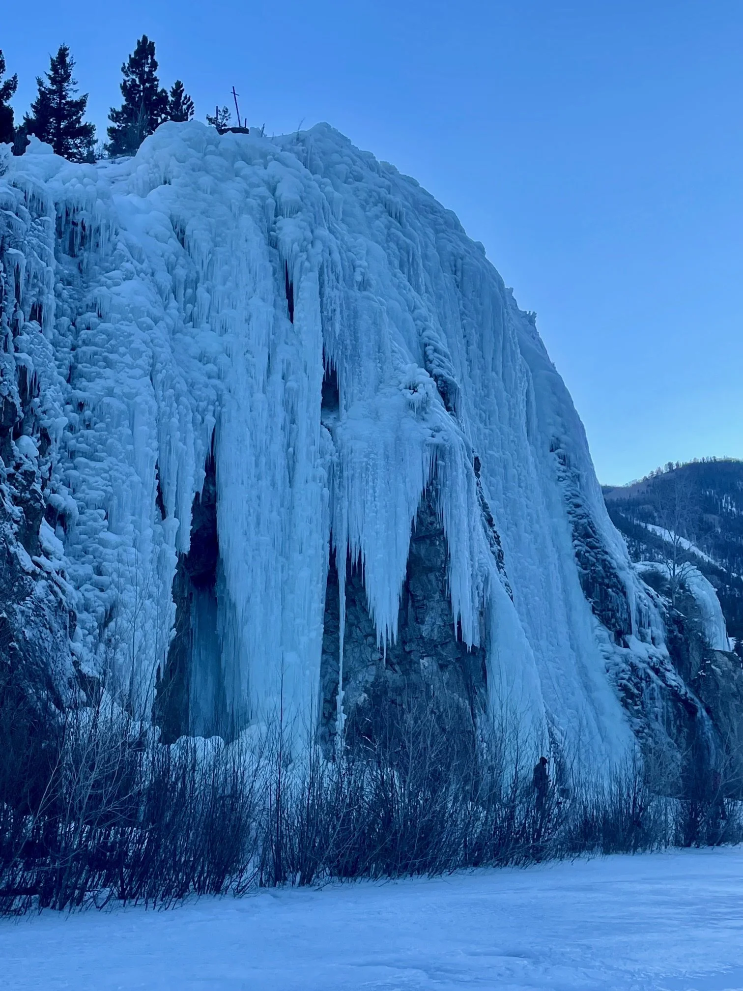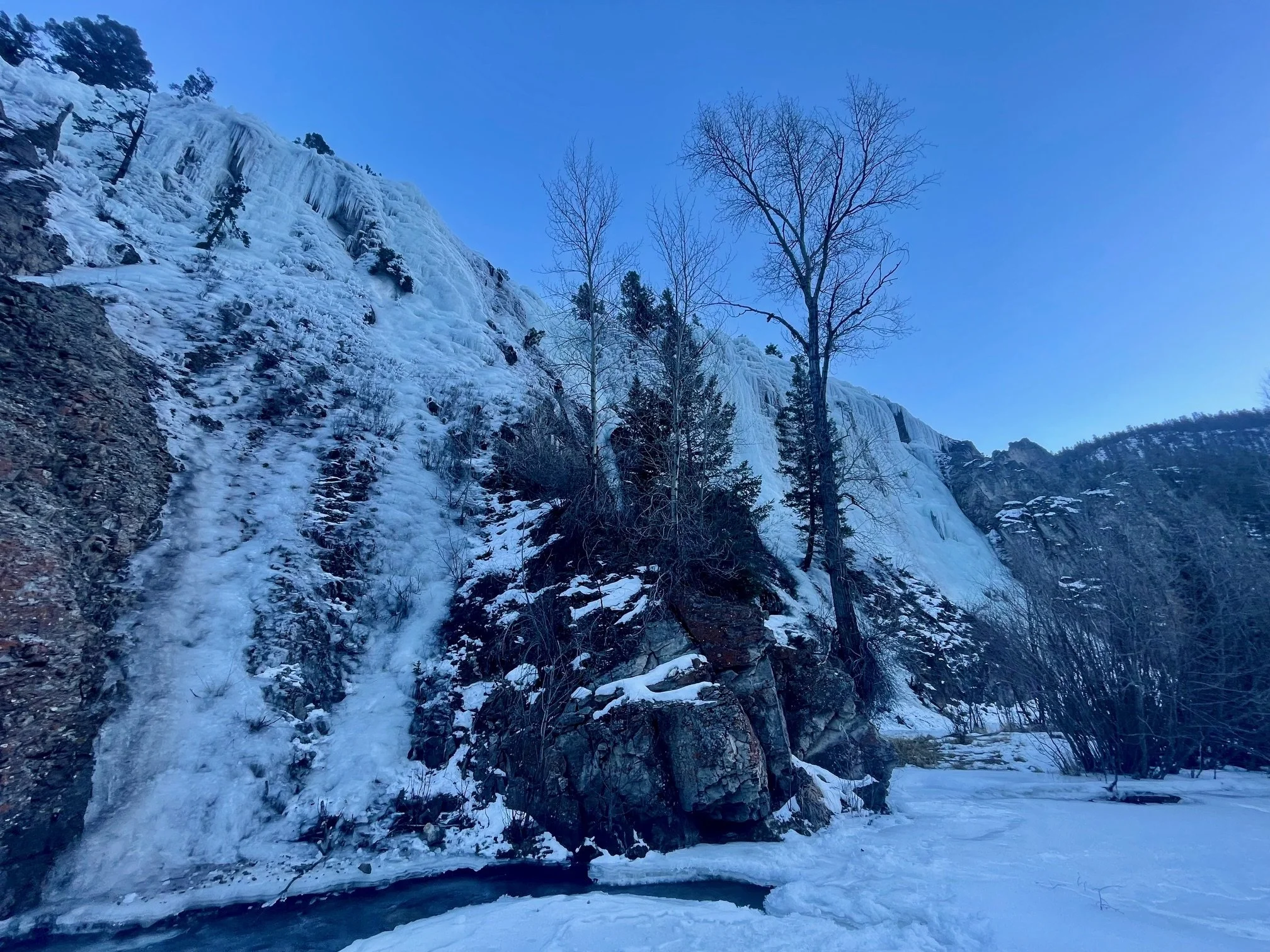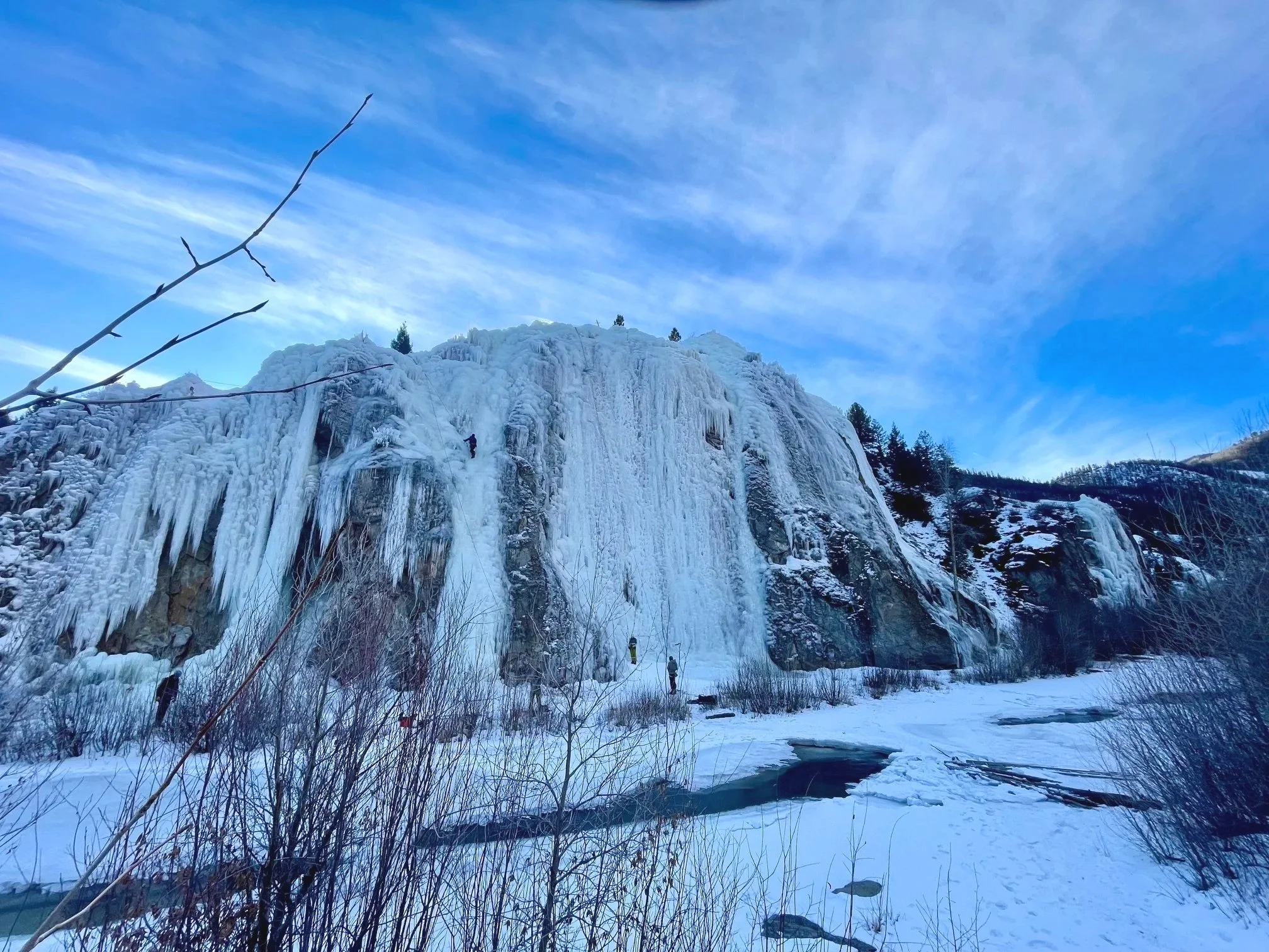 Henson Creek is crossable at all 4 areas and most climbs that start at the river channel are accessible with a little creativity- most of our climbs start on the river bank and are always accessible. Keep in mind you will probably encounter thin ice or variable conditions including chandeliers and jellyfish. Remember to look out for hollow spots right at the top of the cliff from where we spray the water especially when leading. Watch your feet! Our pipes and hoses can be punctured by crampons.