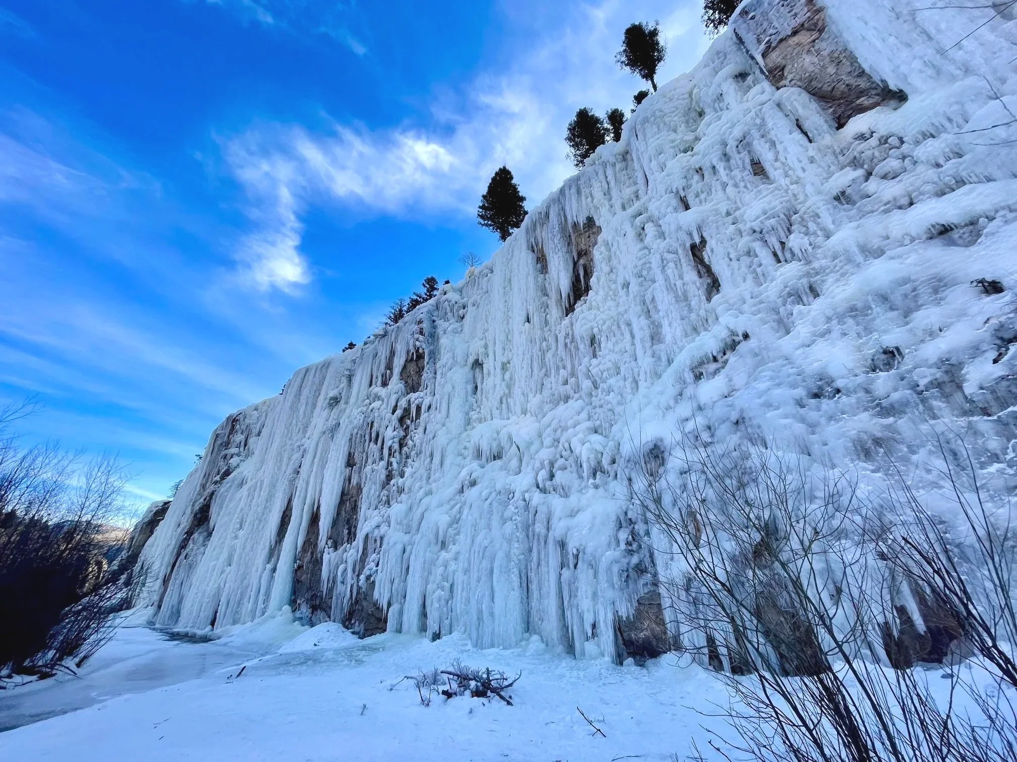 Beer Garden also has 10-15 routes that are climbable. There is a 50’ section of creek that still is open water. We put some logs across at different spots on the open water today. We are hoping that will accelerate the freezing. The water is only 12 inches deep anyway so get stoked and be creative and climb those great routes.