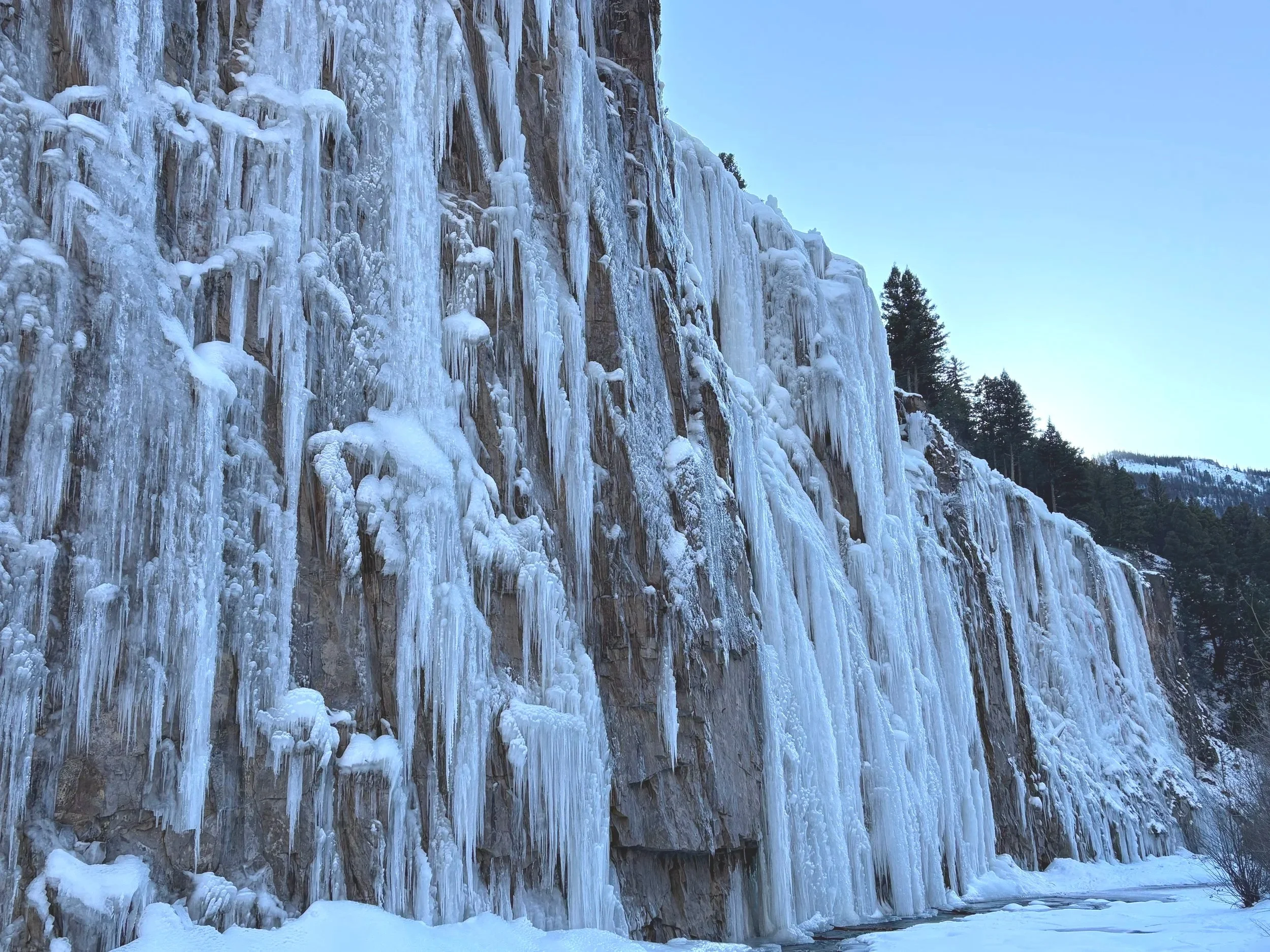 Henson Creek is crossable at all 4 areas and most climbs that start at the river channel are accessible with a little creativity- most of our climbs start on the river bank and are always accessible. Keep in mind you will probably encounter thin ice or variable conditions including chandeliers and jellyfish. Remember to look out for hollow spots right at the top of the cliff from where we spray the water especially when leading. Watch your feet! Our pipes and hoses can be punctured by crampons. ***Remember these are imperfect assessments. Make sure you do your own homework. As always, all the climbing in Lake City is truly CLIMB AT YOUR OWN RISK.